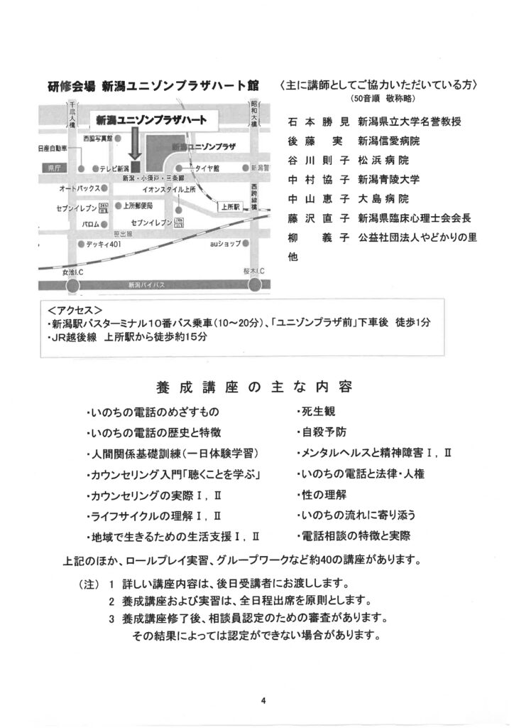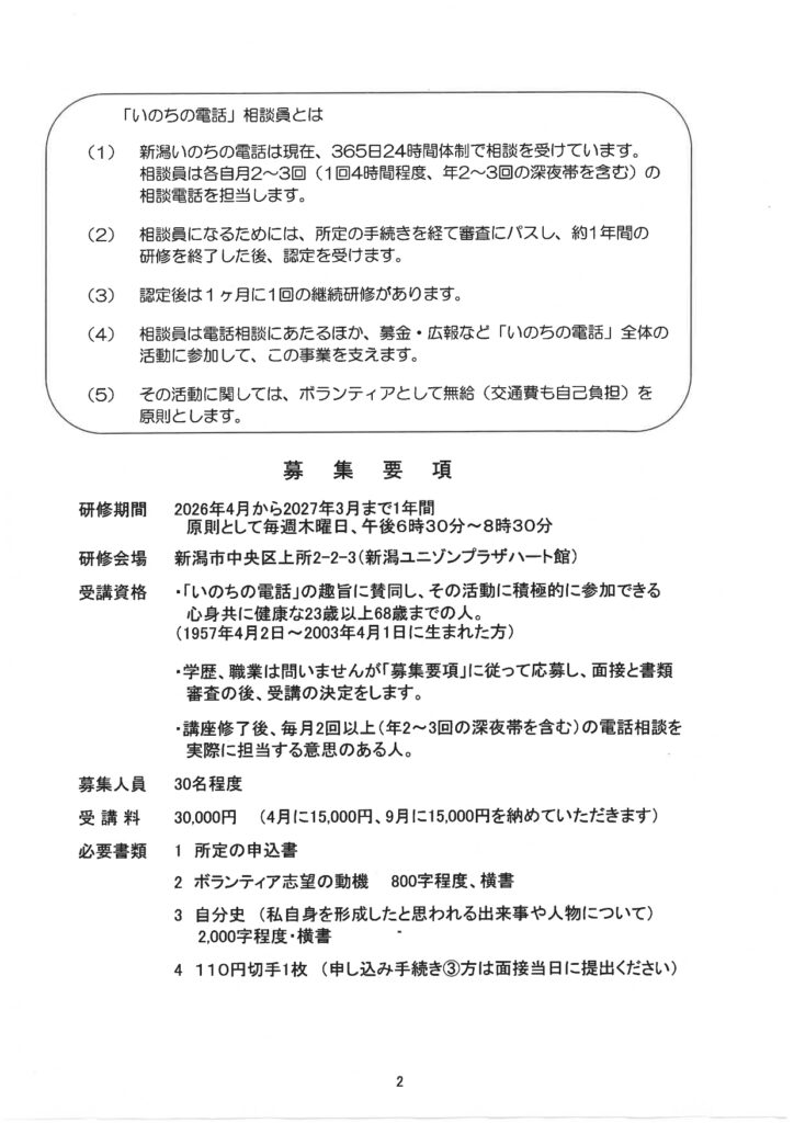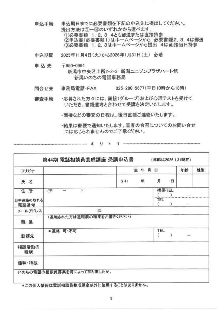 新潟いのちの電話 MENU いのちの電話とは 相談する 相談例 相談員募集 支援・寄付する 新着情報 イベント情報 後援会 情報公開 プライバシーポリシー 電話で相談する つながらない場合はこちら 電話相談員養成講座お申し込み トップページ 電話相談員養成講座お申し込み 新潟いのちの電話 第44期 電話相談員養成講座 受講申込書 相談員養成講座のお申し込みは下記内容の通りです。一番下にあるボタンをクリックすると、資料を一括ダウンロード出来ます。 ダウンロードはこちら 2026年度養成講座募集要項ダウンロード(PDF) PAGE TOP